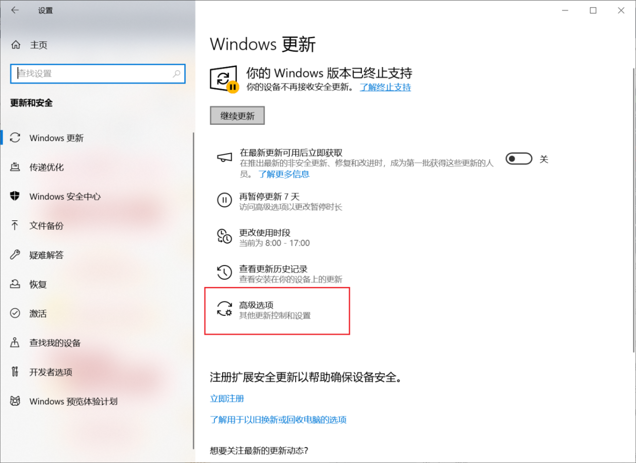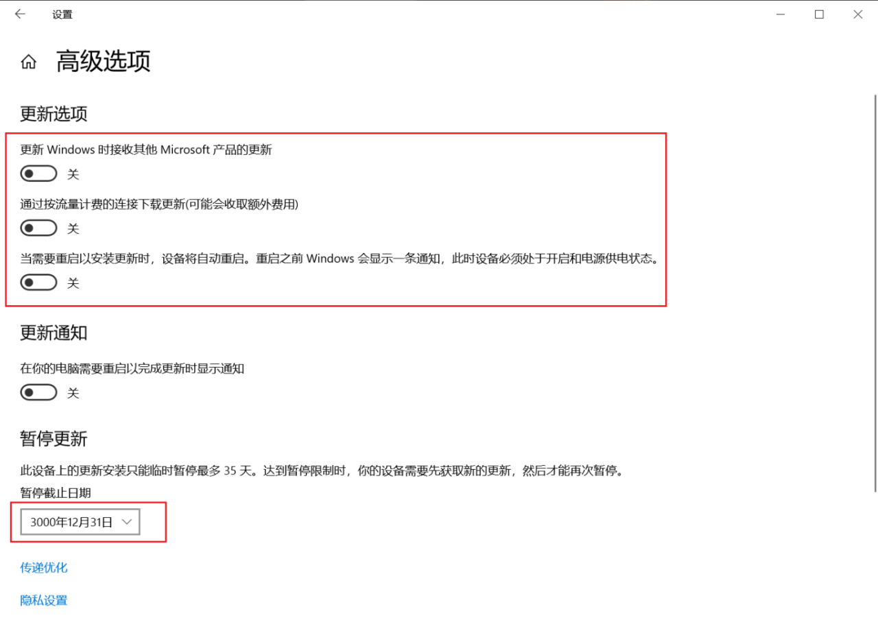 2.在windows更新面板,点击高级选项3.在高级选项面板中,将更新选项中的选择项改为关闭状态,暂停更新中原暂停截止日期最多35天,现在已改为3000年12月31日