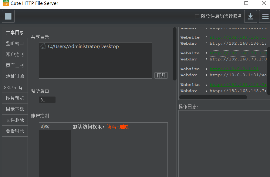 服务正常启动后,可以看到界面右上方此时显示website与webdav的地址与路径: