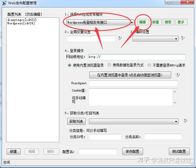 将 WordPress免登陆发布接口.wpm 放到火车采集器下的 Module 文件夹, 参照下图创建Web发布配置