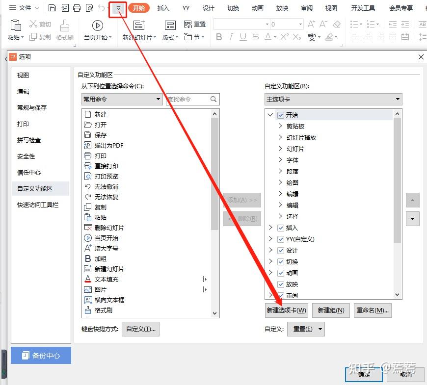 框中的下拉框——>其他命令——>到下图中的界面了,就可以新建选项卡和新建组了,就能把常用的命令集合到一起面板下。