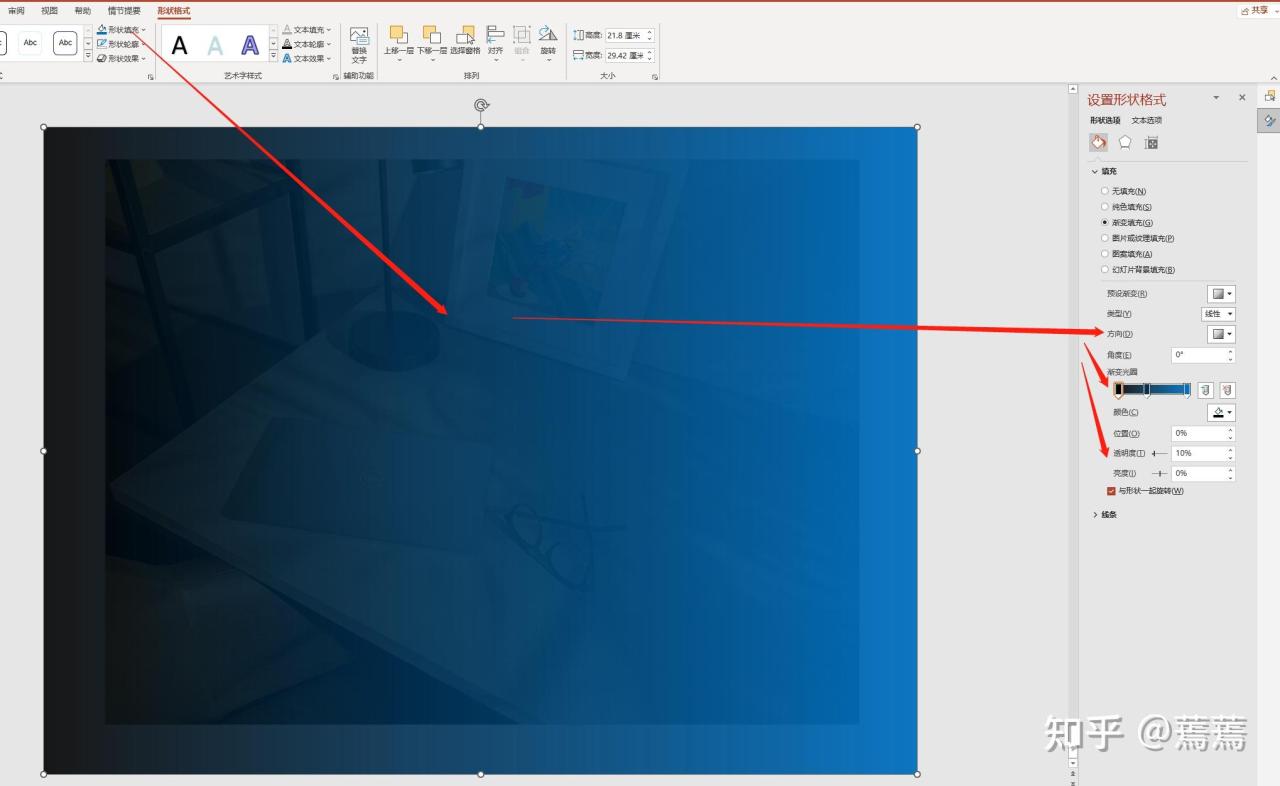 tep1:剪裁图片到PPT尺寸设计、设计灵感,可以选择把一张图片直接剪裁成和PPT一样尺寸。前提,当这页中只有这一个图片的时候使用校正/颜色,把图片的亮度调整低tep2:绘制一个矩形形状,做透明填充形状轮廓选择无,形状填充(取其他填充颜色)选择一个颜色、在自定义里把透明度调整成50%